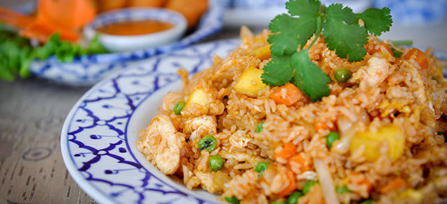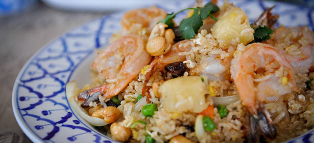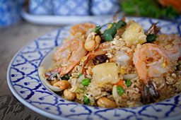 Stir-fried jasmine rice with chunk of pineapple, egg, onion, cashew nut, bell pepper, and yellow curry powder
