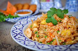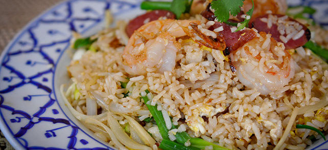 Fried rice with shrimp, Thai sausage, peas, carrot, onion, green onion and cilantro