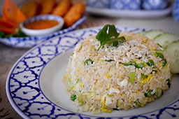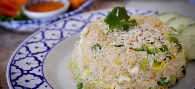 Fried rice with crab meat, egg, onion, green onion and cilantro
