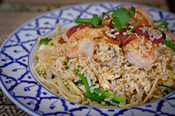 Stir-fried jasmine rice with shrimp, scallop, mussel, squid, white fish, egg, onion, green onion and cilantro